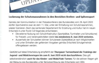 Unsere Schulen (Primar+Oberstufe) werden nach 6 Wochen wieder mit dem Präsenzunterricht am 11.5. starten. Wir hoffen, dass dann auch unsere Trainingshallen wieder geöffnet werden. Bis dahin bleiben wir sicher zu Hause und halten uns fit mit Heimtraining. Hier die Informationen vom Thurgauer Turnverband.